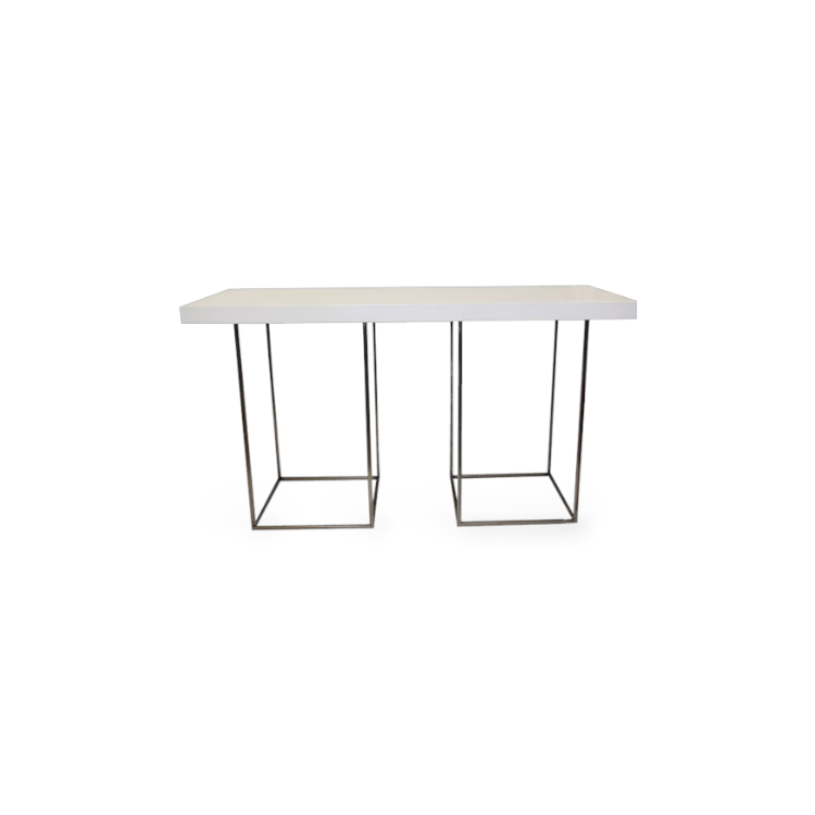 Lange Statafel met stalen frame en wit bovenblad.